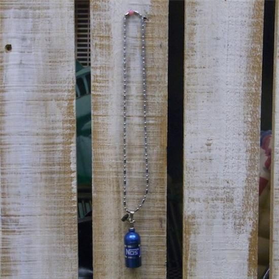 NOS a.k.a. Nitrous Oxide Systems 映画、ワイルドスーピードでドムとレティ ガンガンに使ってましたねぇ。 ただのネックレスに見えますが TOP部分に穴が開いてましてね。 際の使い方を1例出すと、、、 ここにフレグランス入れて車のミラーに飾ってもいいですよ、使い方いろいろ!SIZE H6cm(ボトル本体) SIZE H29.5cm(チェーン含む)