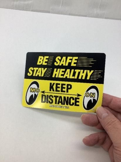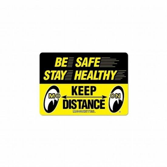 新しい生活様式に、MOONEYES がメッセージを発信! 遠くから見ても解りやすいイエロー x ブラックのカラーリングで、 BE SAFE STAY HEALTHY KEEP DISTANCE のメッセージが入ったステッカーです。 MOON アイシェイプ ロゴがソーシャル ディスタンスを取っているレア デザイン! 人と人との距離を保つようにお願いするメッセージ ステッカーとして、混雑する店内や室内など場所を問わず貼れるサイズ感です。 水にも強く、室内、屋外問わず、手軽に使えます。 今をより安全に過ごすために、大切な FAMILY や FRIENDS のためにお使いください! ※4角は角丸になっています。 サイズ:H約13cm x W約9.1cm
