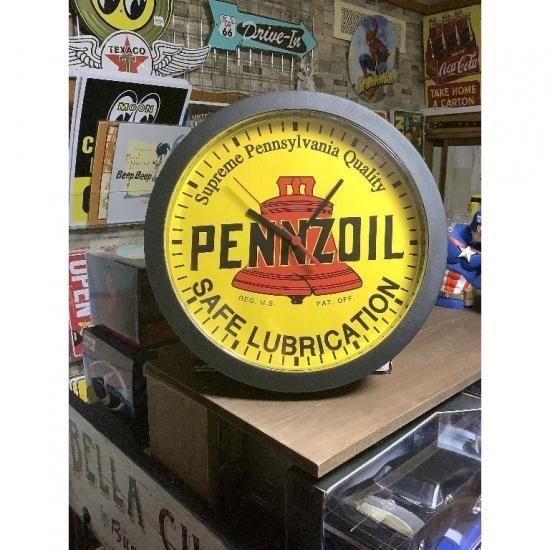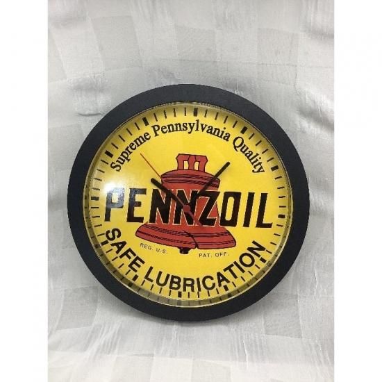 PENNZOILのロゴ入り壁掛け時計です。