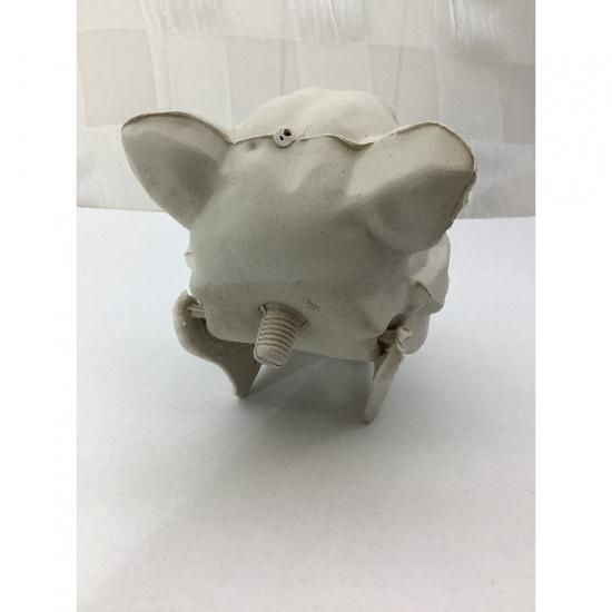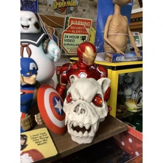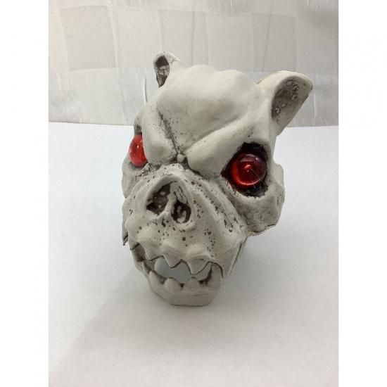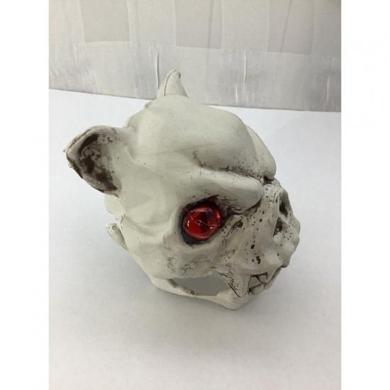 眼が赤く光ってちょっと怖いブルドッグのプラスチック製の頭蓋骨です、魔除けにいかがですか?サイズH11 W9 D10cm