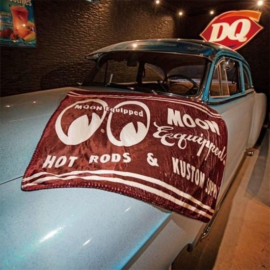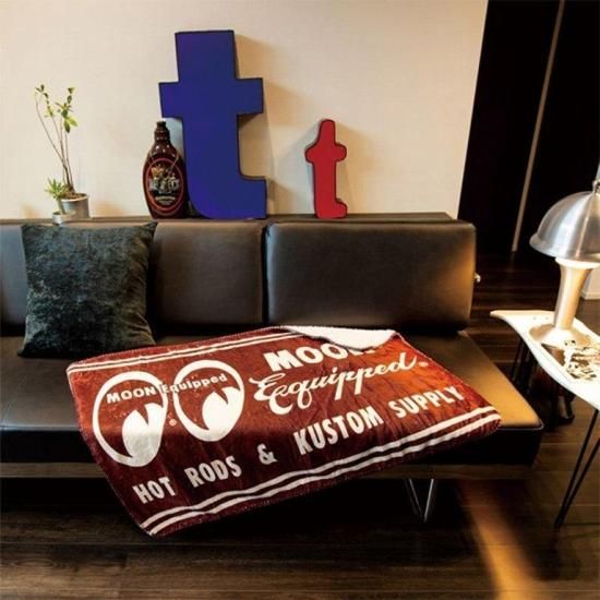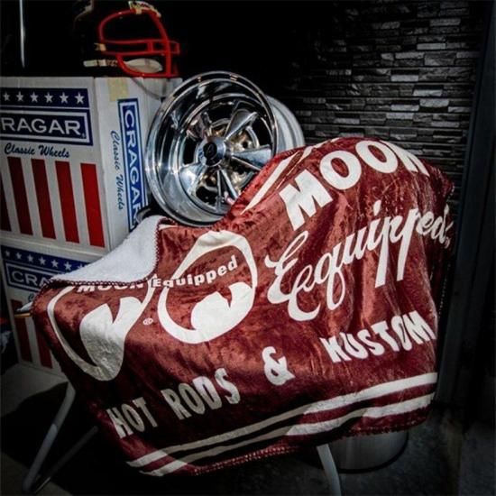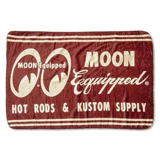 MOON Equipped アイシェイプ ロゴに、HOT ROD KUSTOM SUPPLY をフィーチャーした温かみのあるチョコレート ブラウン カラーのソフトな暖かさとスタイルを兼ね備えたフリース ブランケット。