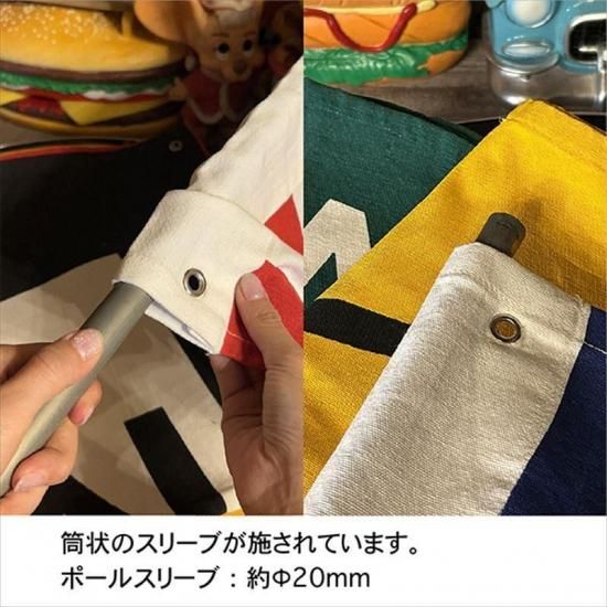 四隅にハトメ穴、左サイドにはポール通しが施してあるので、立てかけたり、